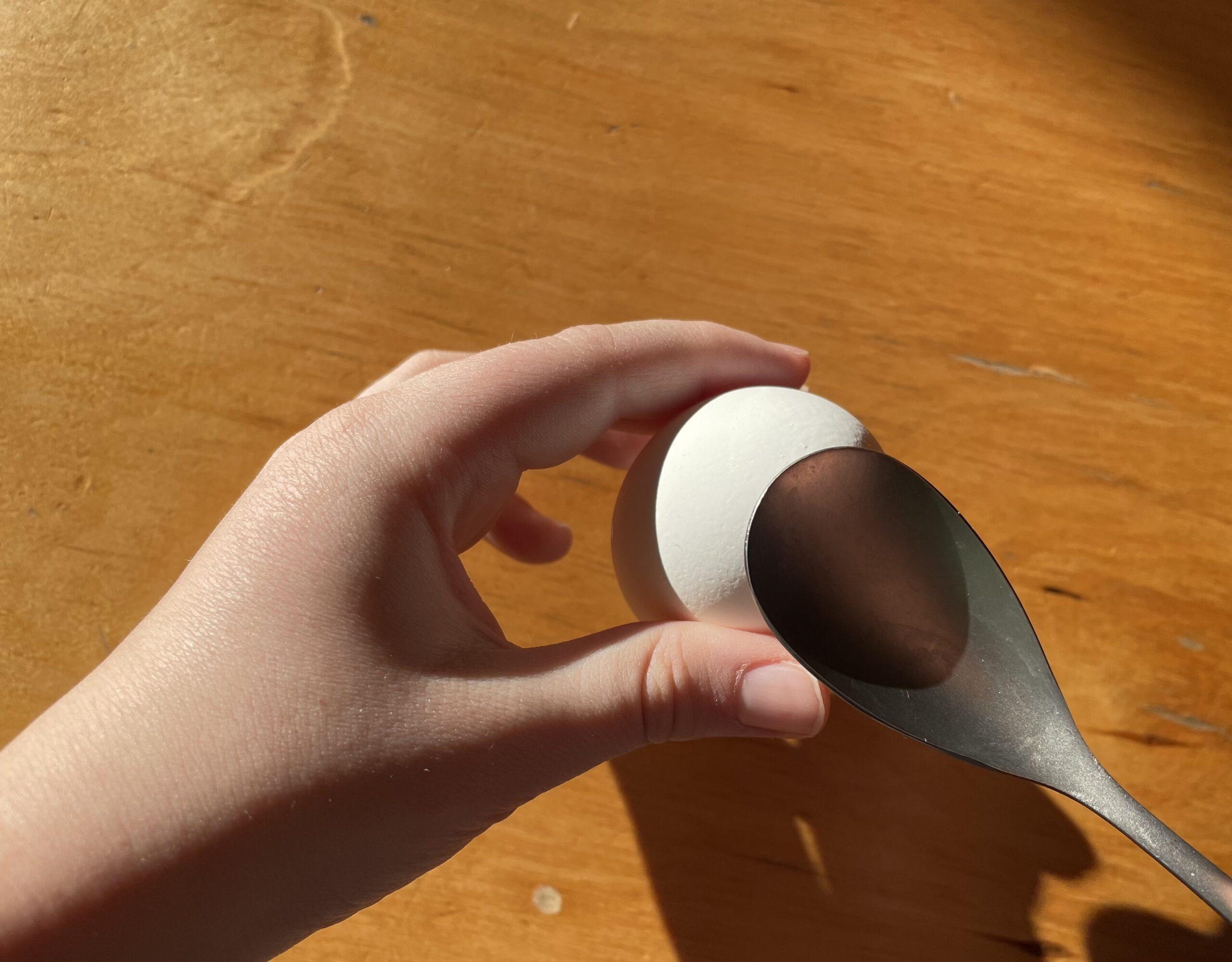 1. Võta toores muna ja koputa lusikaga õrnalt vastu selle teravamat otsa, nii et munakoorde tekivad väiksed praod.