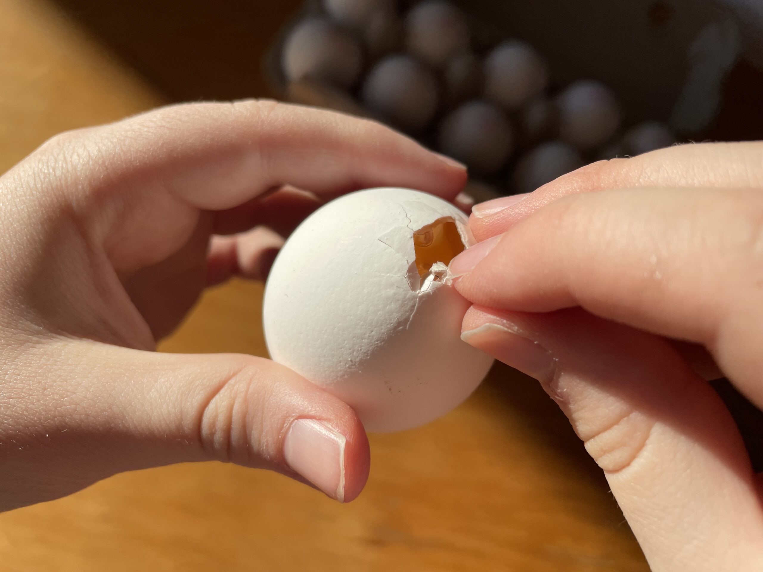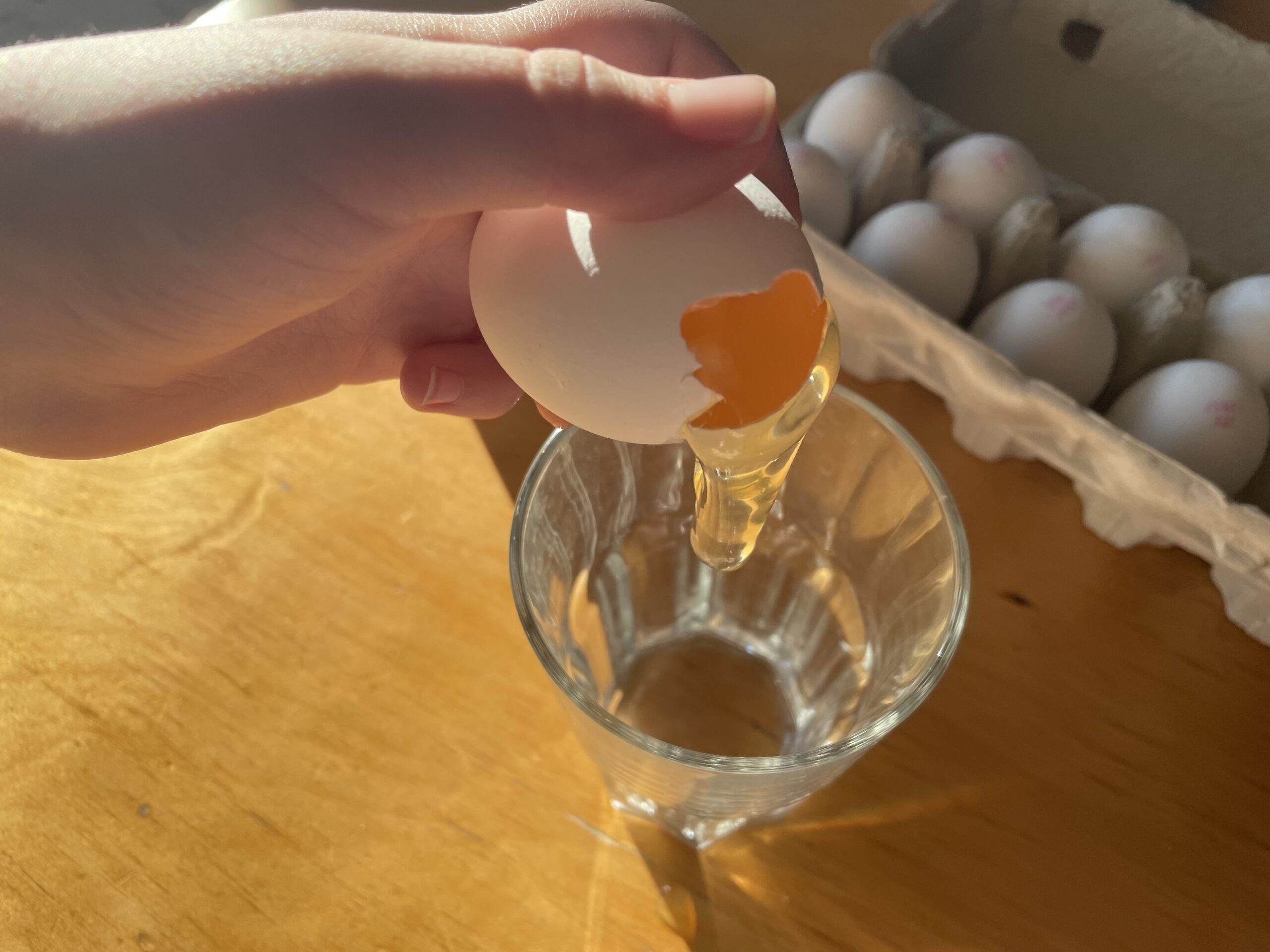 2. Tee sõrmede abil munakoore sisse väike auk. Vala munasisu selle kaudu tassi või kaussi.