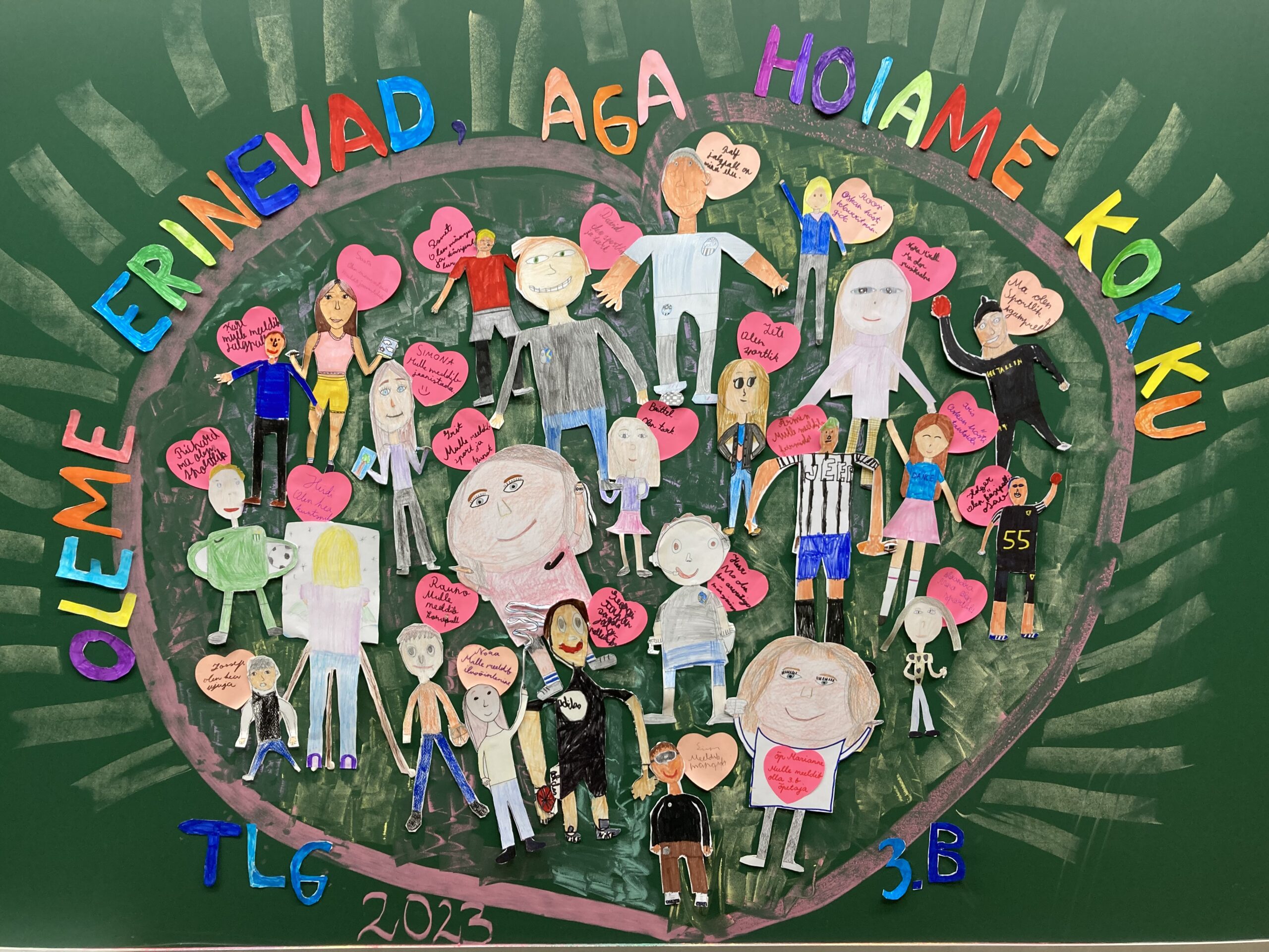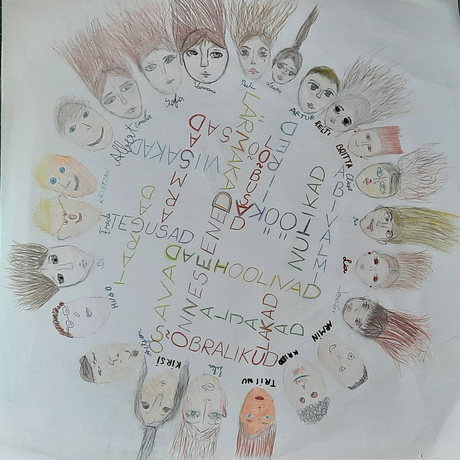 Leidsime, et tegu on omapärase lahendusega, kus iga laps on joonistanud autoportree ja lisaks põiminud töö sisse sõnad, mis klassi laste arvates neid iseloomustavad. Ja kõik kokku moodustab päikese ja on rõõmsalt tulevikku vaatav.